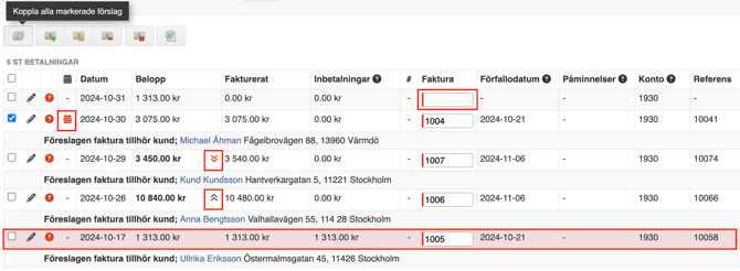 - Röda pilar ned. Betalningen understiger fakturabeloppet. Se till att inbetalningen matchar med fakturan så inte kund betalat in på ett felaktigt fakturanummer, ändra annars. Koppla (del)betalningen och fakturan får status "Delbetald". När nästa del- eller slutbetalning inkommer blir det återigen med en varning (röda pilar ned) att beloppet är lägre än fakturerat belopp men summeras med tidigare inbetalning/ar och fakturan får status "Betald" när full betalning erhållits.