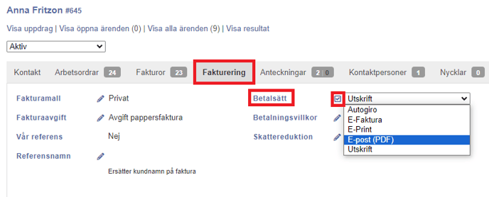 - Välj sen E-post (PDF) som betalsätt genom att klicka på pennan vid fält betalsätt.