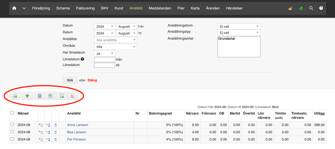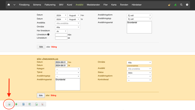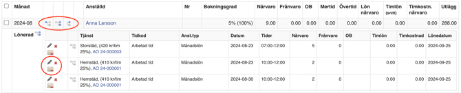 Symbolmenyn på sidan Anställd → Löneunderlag (lönerader)