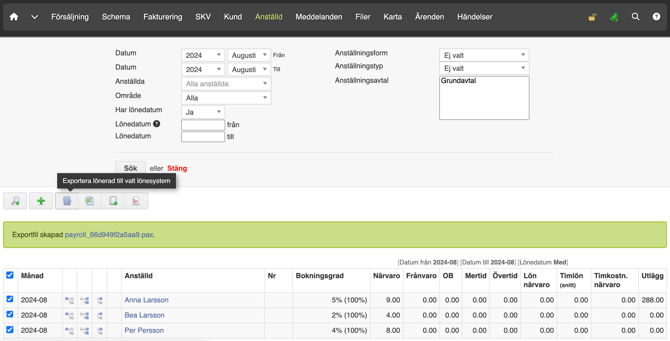 För att skapa ett löne- och ett schemaunderlag till valt lönehanteringssystem, kryssa i aktuella anställdas lönerader på sidan Anställd → Löneunderlag (Ny) och klicka därefter på ”Exportera lönerad till valt lönesystem”
